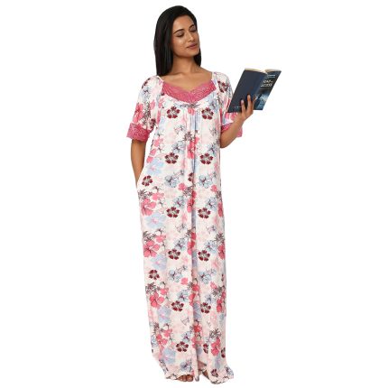 JSS 13003 – Printed Poly-Viscose Nighty for Women – Square Neck, Half Sleeves